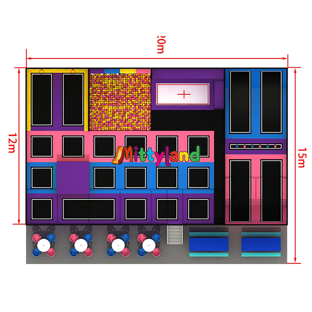 This trampoline park covers an area of 300 square meters, with dimensions of 20 meters in length, 15 meters in width, and 5 meters in height. It includes the following facilities: Professional Trampolines, Free Jump Trampolines, Slam Dunk, Foam Pit, Rock Climbing Wall, Airborne Parkour, and Dodgeball Trampoline.