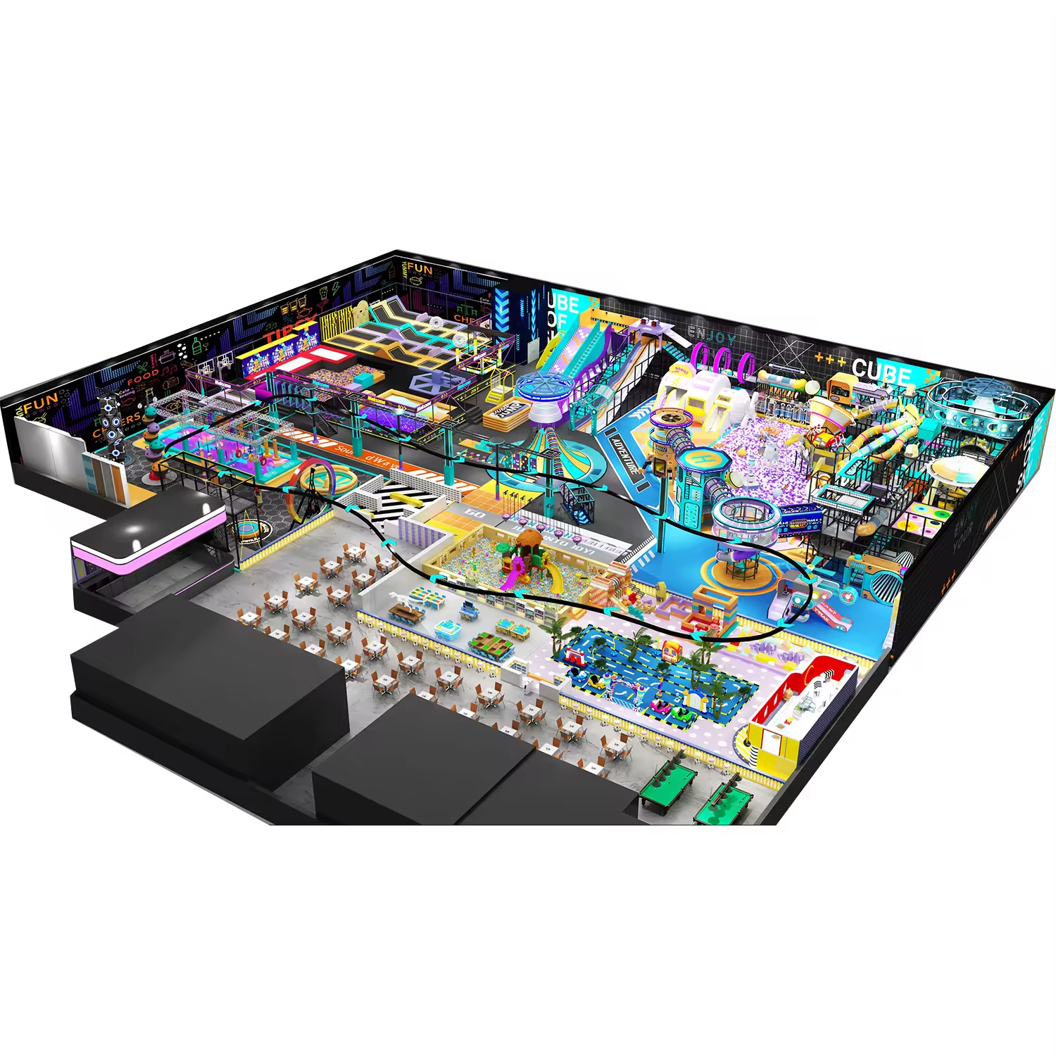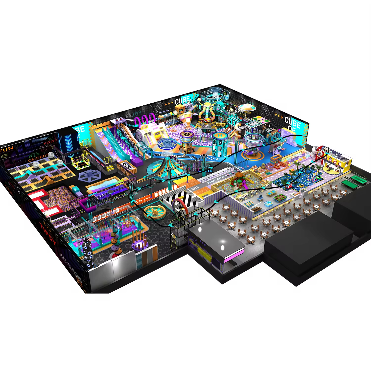 Diverse Activity Zones: A large space allows for distinct areas that cater to different types of movement. It can house everything from massive slide towers (including winding tube slides, straight speed slides, and even bumper slides) to dedicated trampoline zones, obstacle courses, rope climbs, and suspension bridges. Children can switch from burning energy on a climbing wall to having a quiet moment in a designated soft play area.