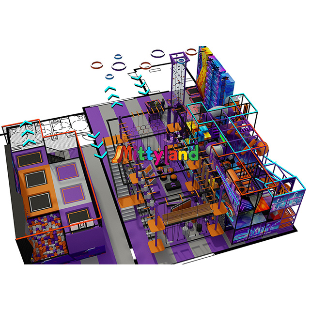 Here you'll find vibrant climbing nets, suspended ropes, balance beams, and obstacle rings, complemented by geometric pillars with a blue-purple gradient and circular lighting fixtures, creating a strong visual impact. Visitors can be seen nimbly maneuvering through high-altitude ropes, testing their balance on inclined soft mats, or energetically ascending climbing nets. With a well-structured difficulty progression, beginners can try basic balancing challenges while advanced players can tackle high-altitude obstacle combinations. Suitable for parent-child interaction, friendly competitions, or team-building activities, it meets the exercise needs of different age groups, making it a trendy sports park perfect for releasing energy and fostering interaction.