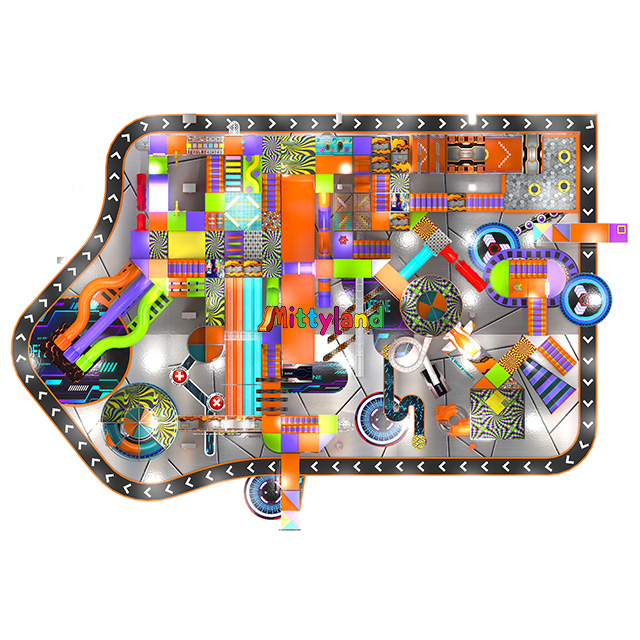 This indoor playground covers an area of 2,800 square meters, with a length of 56 meters, a width of 50 meters, and a height of 10 meters. It includes: Toddler Play, Rope Courses, Climbing Walls, Thrill Arena, Super Runio, and an entrance shoe-changing area.