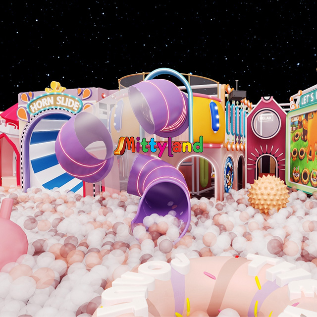 Here, you'll find vibrant slides, including purple trumpet-shaped ones, where children can gleefully slide down and experience the thrill of speed. There's also a ball pool filled with colorful balls, perfect for tumbling, playing, and tossing balls with friends while enjoying fun interactive moments. Additionally, various interesting climbing structures and interactive zones with cartoon patterns allow children to freely explore, climb, and unleash their imagination and creativity.