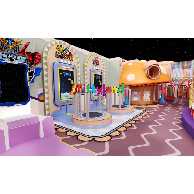 Here, there's a trampoline area where children can bounce freely, experience the joy of being airborne, and develop their balance and coordination. There are also arcade games with cute designs - through interactive screens, kids can participate in various entertaining challenges that sharpen their reflexes and cognitive skills. The adjacent mushroom-shaped cottages add to the magical atmosphere, where children can engage in role-playing games and unleash their imagination.