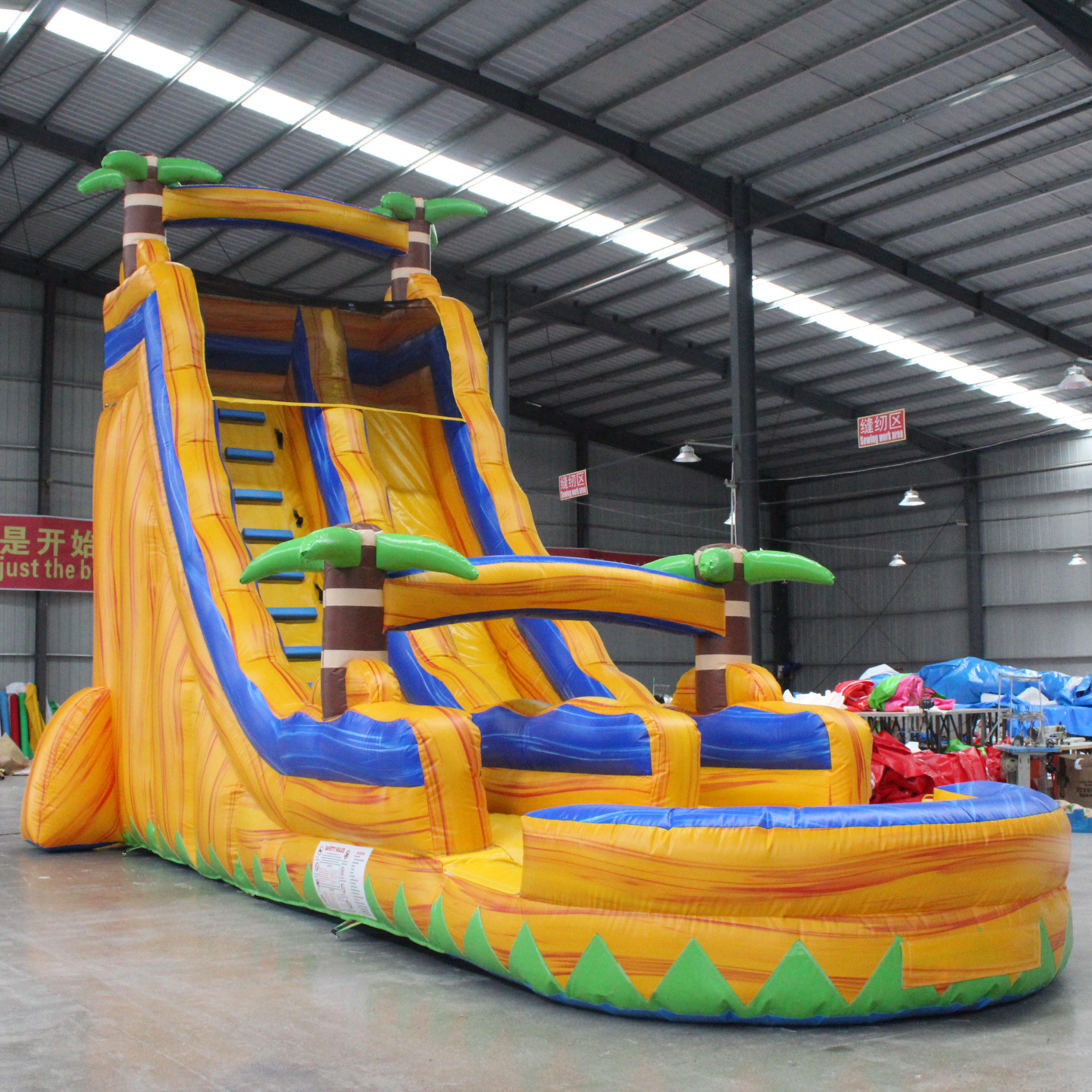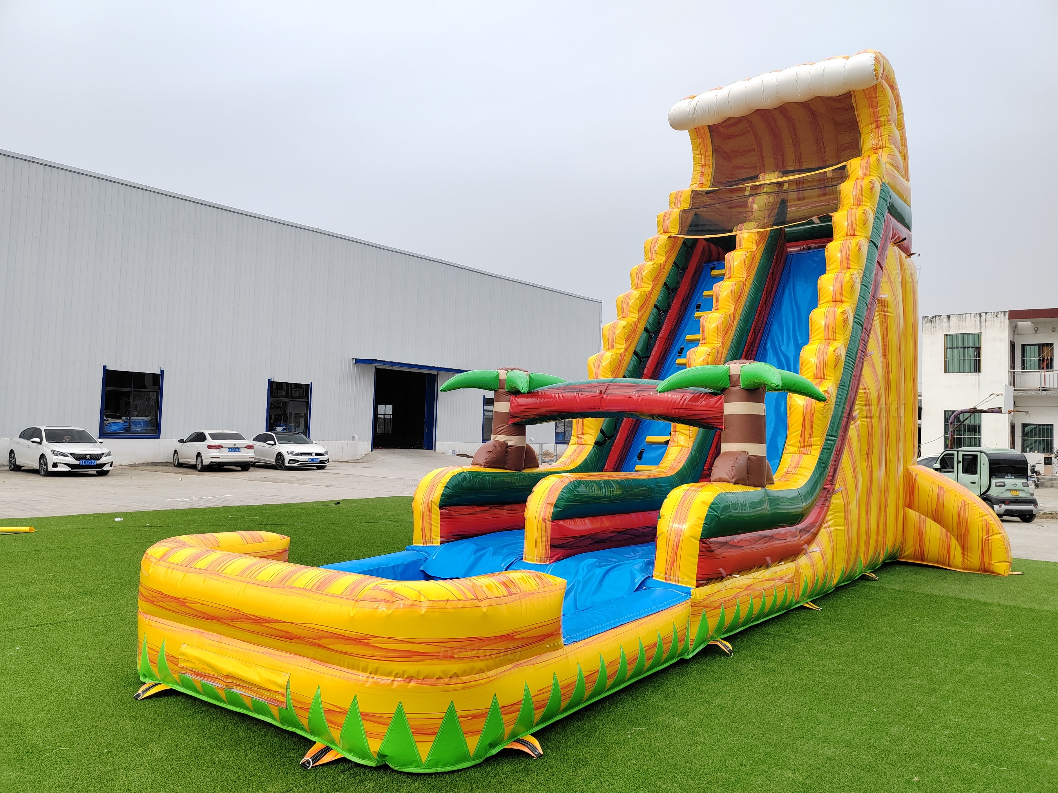 | Excellent Proactive Safety Design | 1. Soft Inflatable Structure: Made entirely of high-strength PVC tarpaulin, with all walls, slides, and platforms being inflatable soft bodies. This fundamentally prevents serious injuries from children colliding with hard surfaces. 2. Optimized for the Water Environment: A shallow pool landing area and a continuous water flow lubricating the slide together ensure a smooth ride and safe cushioning. |