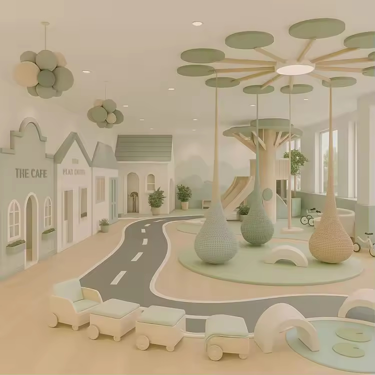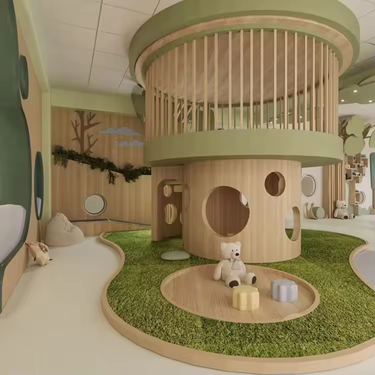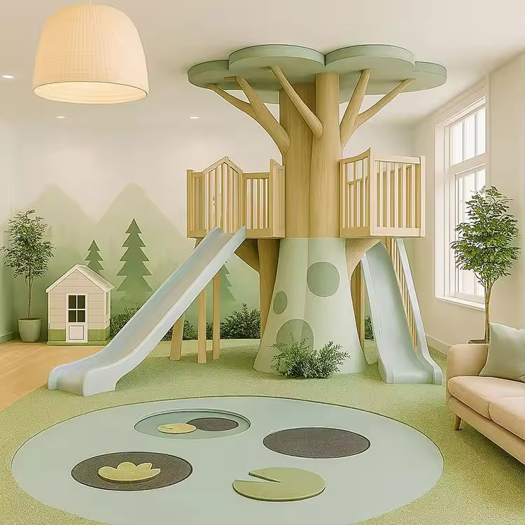 Harmonious Color Combinations: The color schemes across different areas are harmonious and natural. For example, the light green tree house pairs well with the off-white floor and walls, which is not overly stimulating while highlighting the characteristics of each play item.