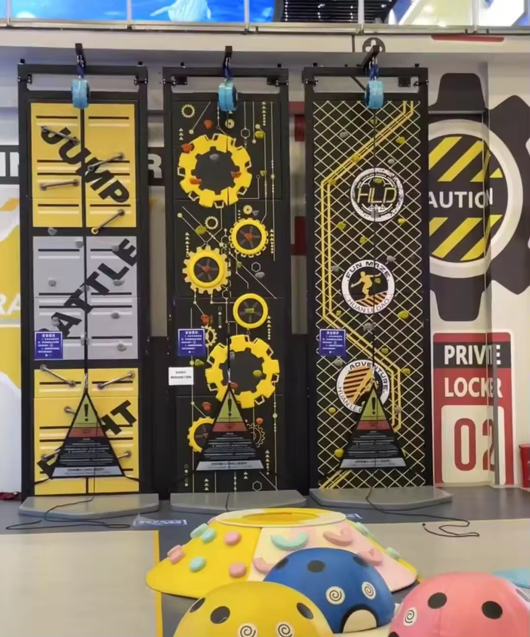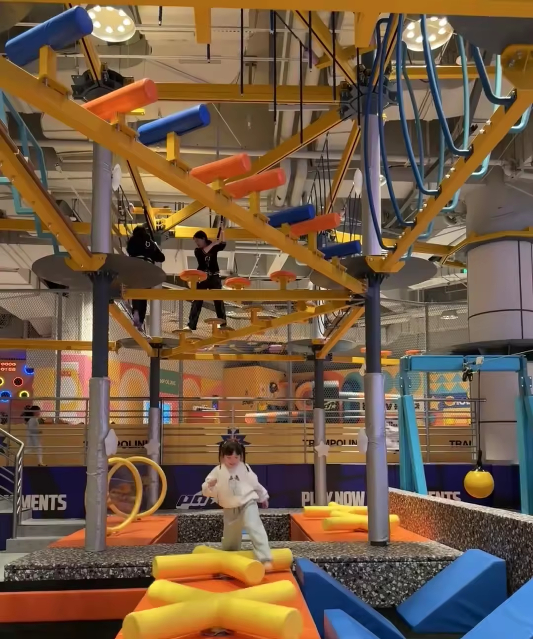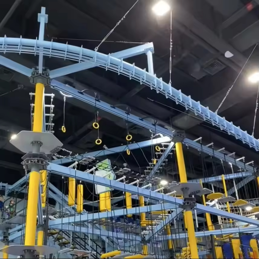 Aerial Ropes Course Adventure Zone: The upper part of the image showcases a complex aerial ropes and bridge system suspended from the ceiling, supported by multiple yellow pillars. This facility is commonly referred to as an "aerial challenge" or "ropes course adventure." Participants navigate various obstacles high above the ground, such as hanging rings, rope nets, and wobbly bridges. This activity not only builds physical strength but also cultivates courage and concentration.