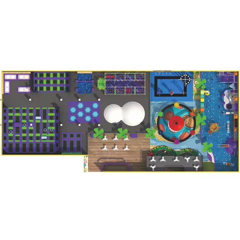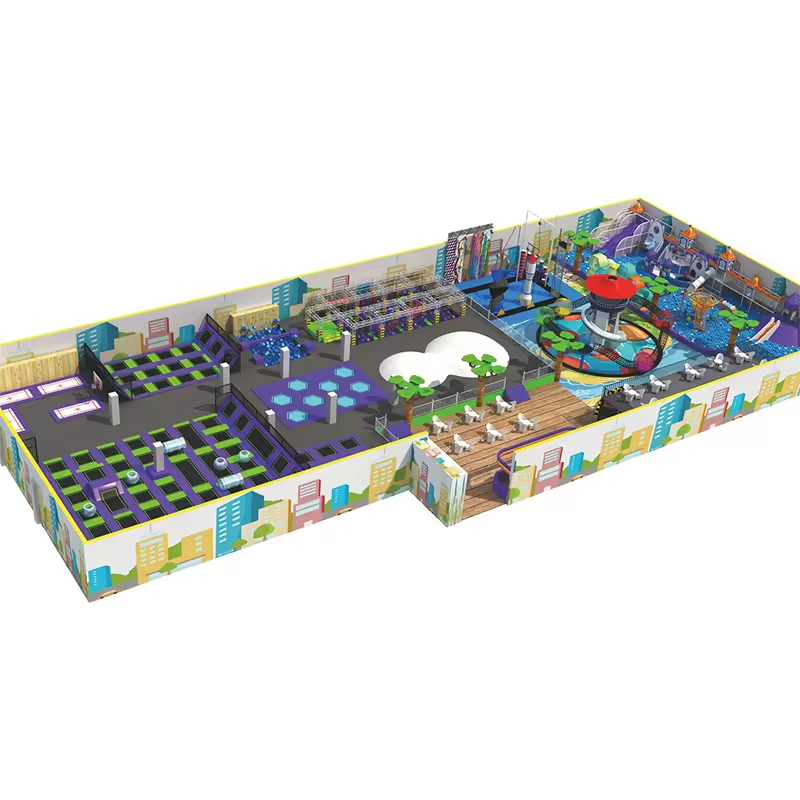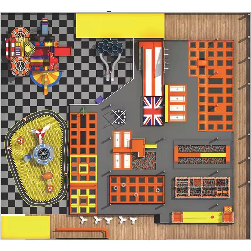 A comprehensive trampoline park can generally be designed to include areas such as a free jumping zone, a climbing wall with foam pit, a ninja course, a professional trampoline and wall-ball zone, a slam dunk area, zip lines, a children’s play castle, and thrilling slides. It is recommended that the venue area be between 600 and 2,000 square meters or larger to ensure an optimal experience for visitors.