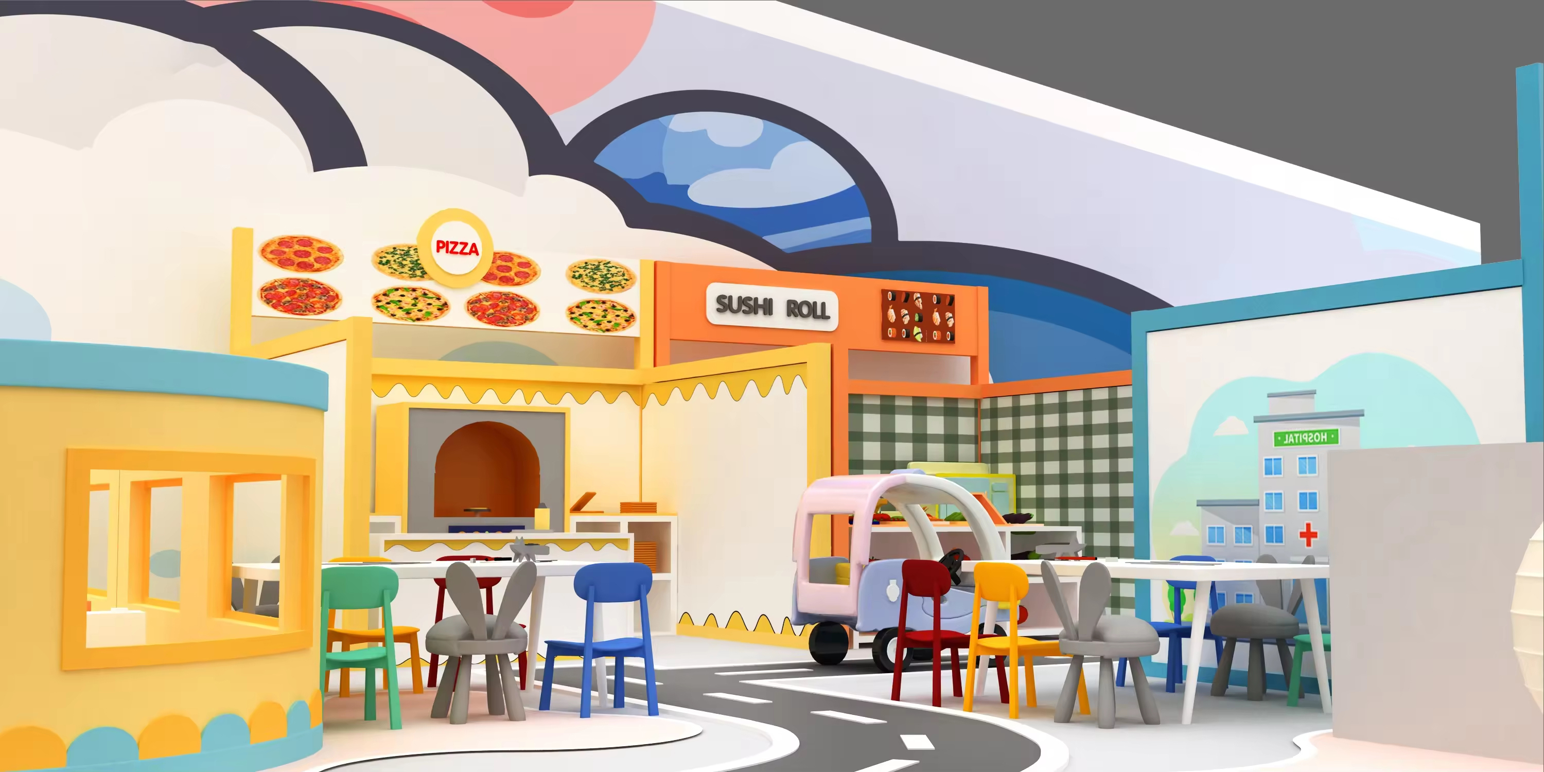 The use of color is equally important in parent-child space design. Research shows that bright colors can stimulate children's curiosity and creativity. In a children's playground, we can use a variety of vibrant hues to create a playful atmosphere—such as a sky-blue background with fluffy white clouds, transporting children into a dreamlike world.