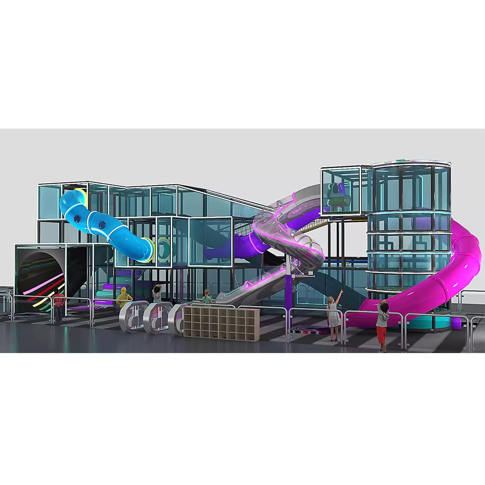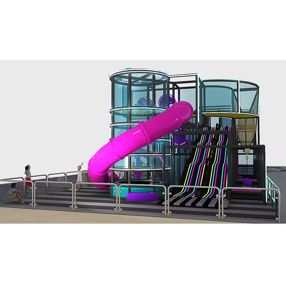 Slides: Includes a blue spiral slide, purple spiral slide, pink spiral slide, and a transparent slide. Their diverse designs offer children a variety of sliding experiences.