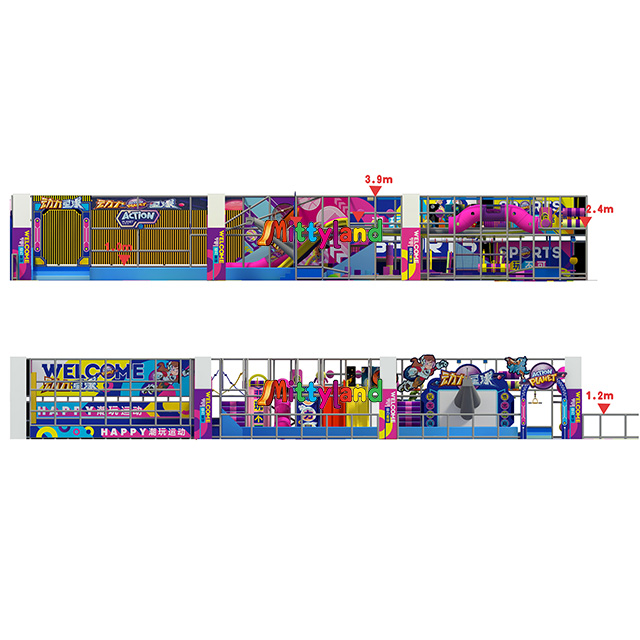 Indoor Playground Zone: 37 meters long, 26.5 meters wide, and 3.9 meters high. It includes: slide carnival, slide tubes, ball pool, crawl holes, crawl nets, climbing nets, climbing frames, climbing ladders, hanging balls, obstacle challenges, punching bags, crossing bars, lookout windows, swinging bridges, long-distance horizontal bars, water wheels, rotating maze, interactive projection ball smash game, net rope bridge, zip line, octopus hanging balls, and soft-pack swings.