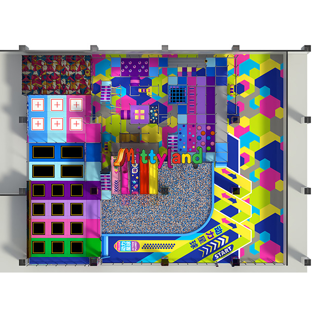 This indoor trampoline park covers an area of 1,500 square meters, measuring 55.6 meters in length, 26.5 meters in width, and 3.9 meters in height. It includes: a trampoline zone, a kids' play zone, and a maze zone.
