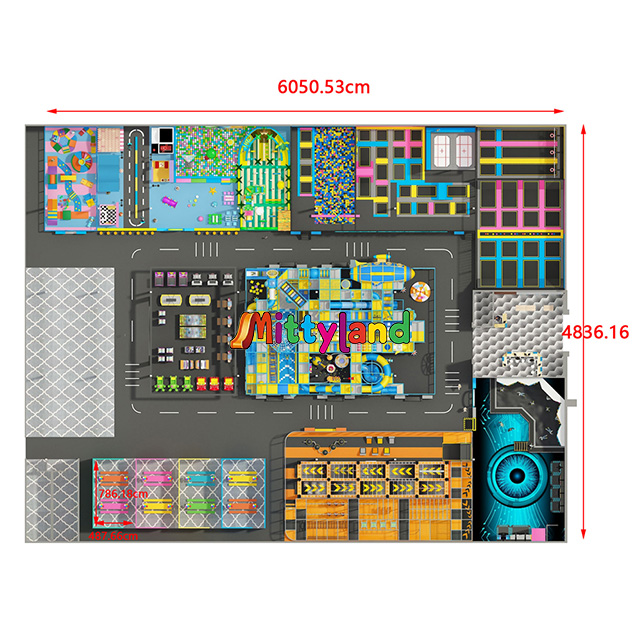 This indoor trampoline park covers an area of 3,000 square meters, with dimensions of 61 meters in length, 48 meters in width, and 6 meters in height. It includes the following zones: Trampoline Zone, Toddler Play Area, Play Castle Zone, Climbing Zone, and Ninja Course Zone.