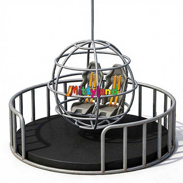 Launch & Rotation: Upon reaching the preset height, the cabin detaches from the column. It is instantly launched by the built-in spring or hydraulic mechanism, simultaneously causing the spherical frame to rotate rapidly around the central axis. The child experiences 360° multi-directional rotation within the airborne cabin.