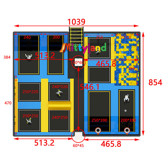 This indoor children's trampoline park covers an area of 88 square meters, with dimensions of 10.4 meters in length, 8.5 meters in width, and 4.5 meters in height. It includes the following attractions: Foam Pit, Rock Climbing, Slam Dunk, Obstacle Trampolines, Spider Wall, and Velcro Wall.