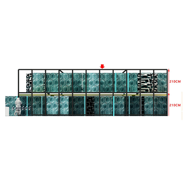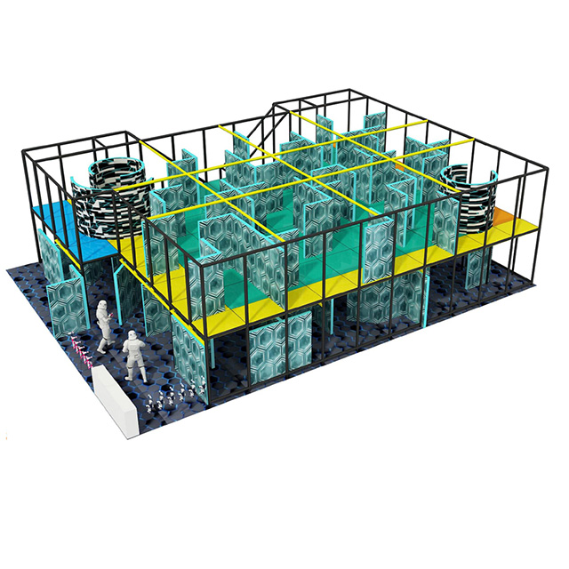 This indoor playground covers an area of 156 square meters, measuring 14.64 meters in length, 10.64 meters in width, and 4.2 meters in height. It includes a maze and a rainbow climbing ladder.